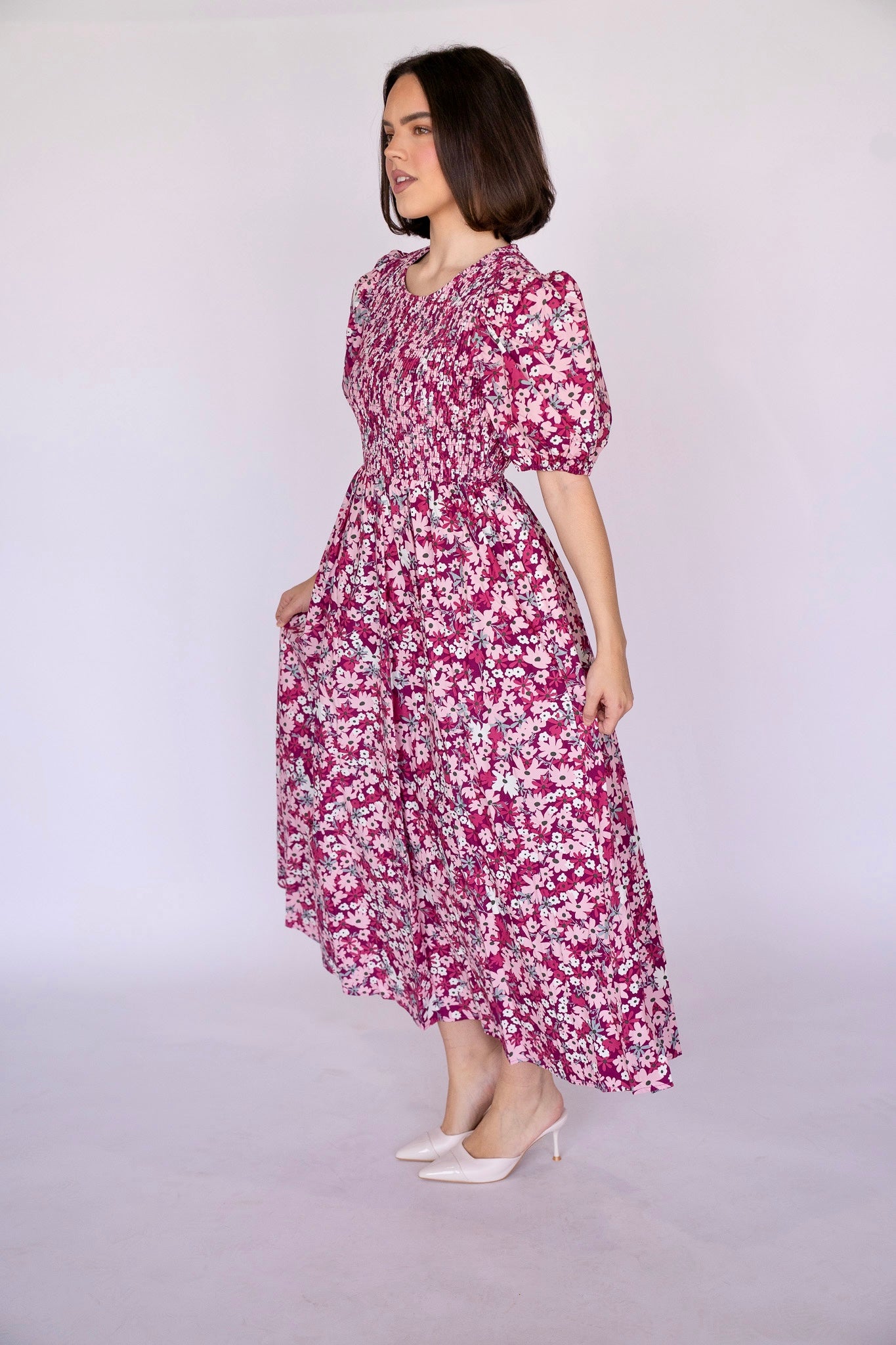 Bold blooms and timeless charm meet in the Bloomfield Smocked Midi Dress. This striking floral number features a fully smocked bodice for a secure, flattering fit and puff sleeves that add just the right amount of drama. The flowy midi-length skirt creates a graceful silhouette that moves with ease, while the vibrant fuchsia and blush floral print gives it a romantic, vintage-inspired feel.