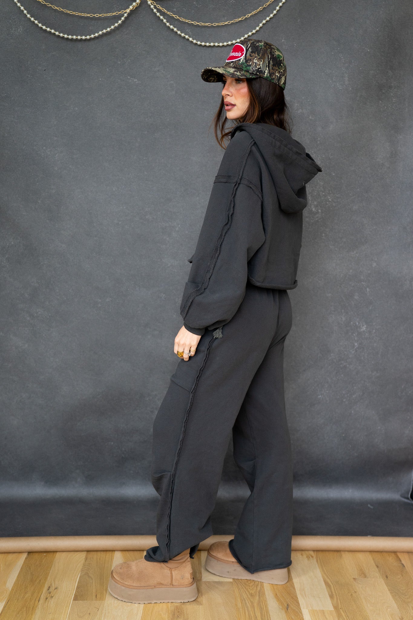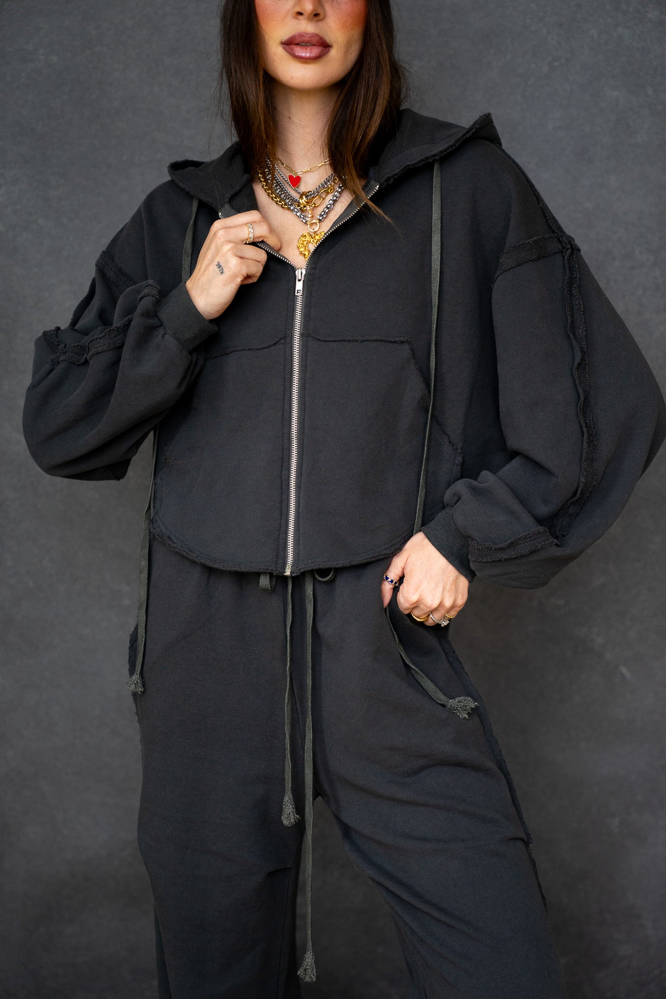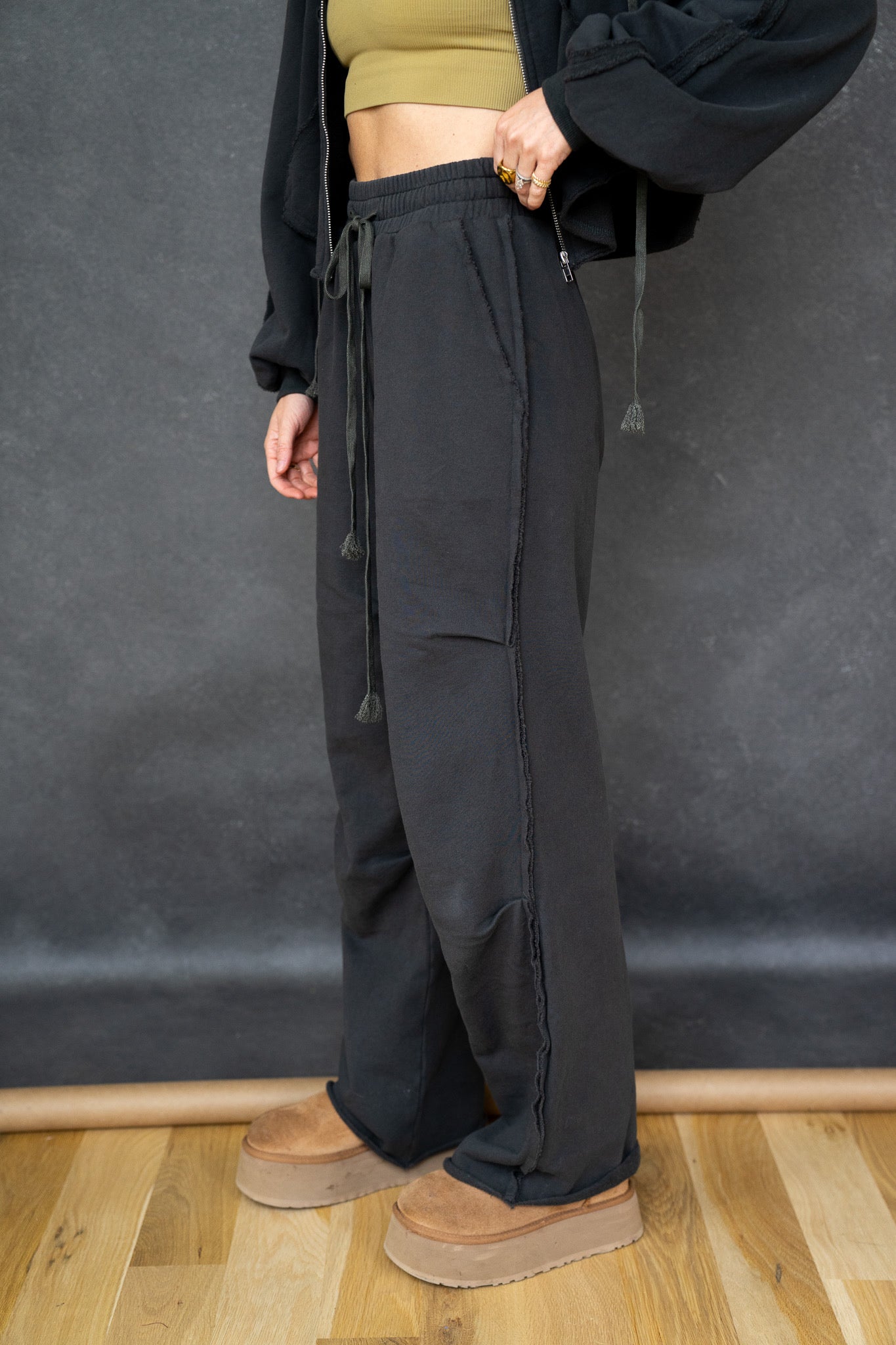 The hoodie has a boxy, slightly oversized fit with drop shoulders and adjustable drawstrings for an easy, lived-in vibe. The pants sit comfortably at the waist with a soft elastic band and drawstring, flowing into a loose, slouchy leg that drapes just right. Finished in a washed charcoal/black tone, the Chelsea Set has that perfectly worn look you’ll reach for again and again.