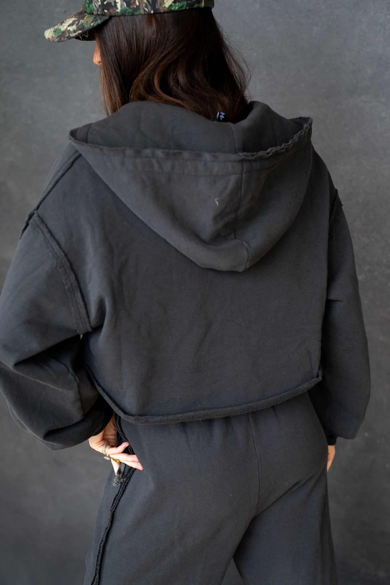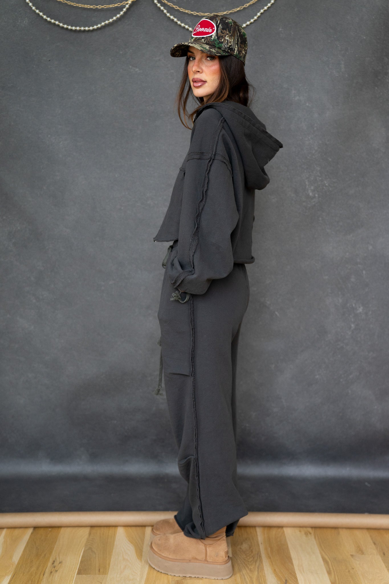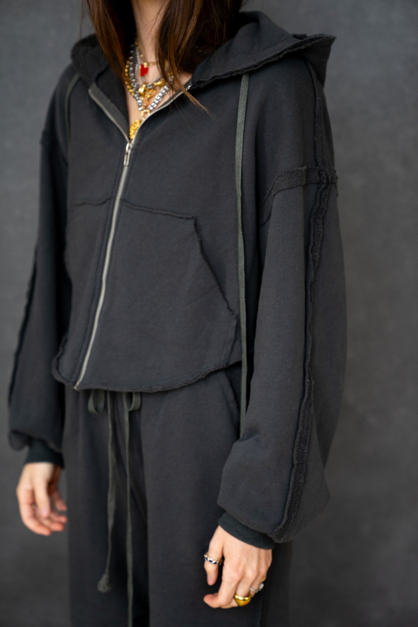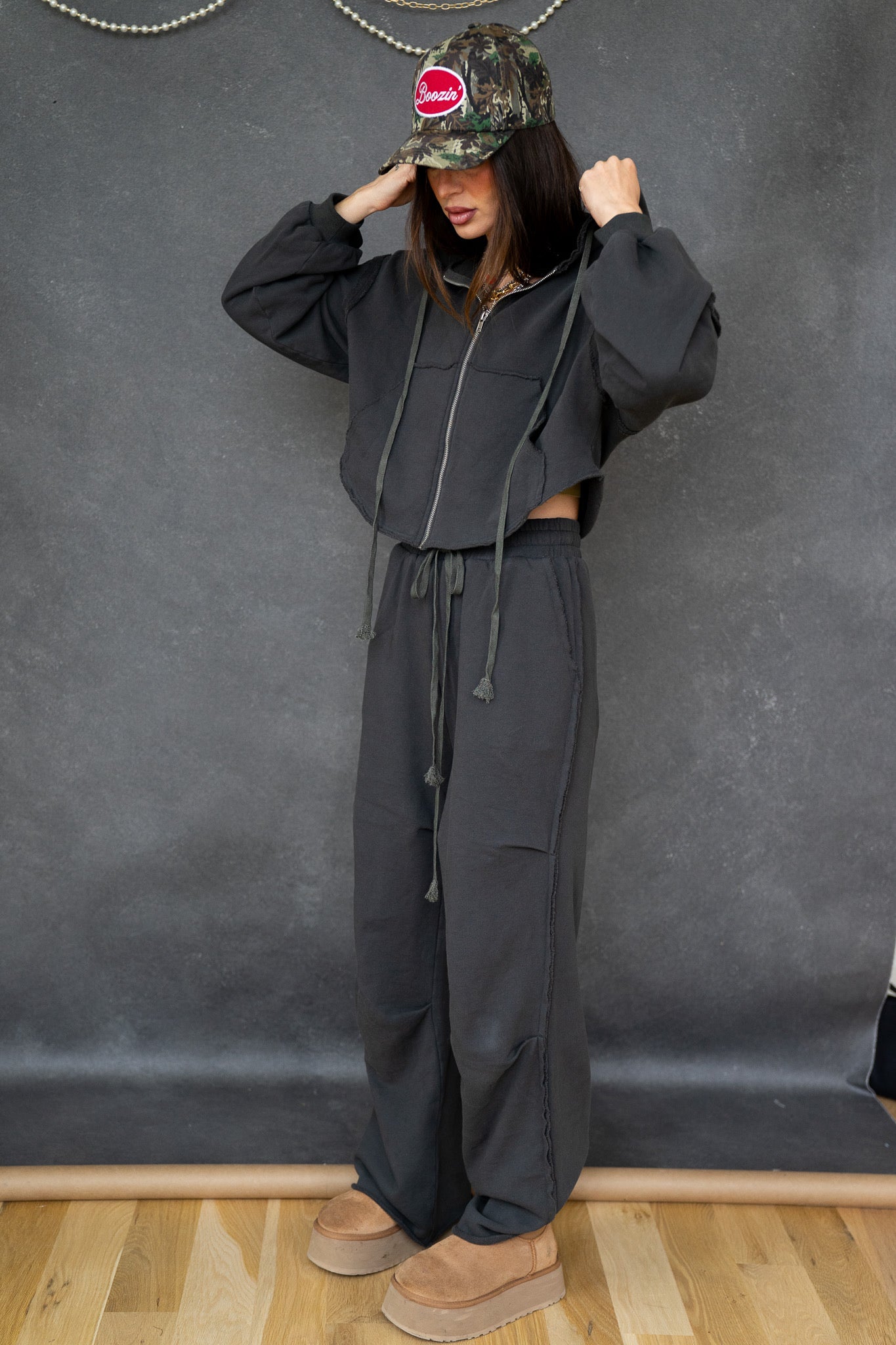 The hoodie has a boxy, slightly oversized fit with drop shoulders and adjustable drawstrings for an easy, lived-in vibe. The pants sit comfortably at the waist with a soft elastic band and drawstring, flowing into a loose, slouchy leg that drapes just right. Finished in a washed charcoal/black tone, the Chelsea Set has that perfectly worn look you’ll reach for again and again.
