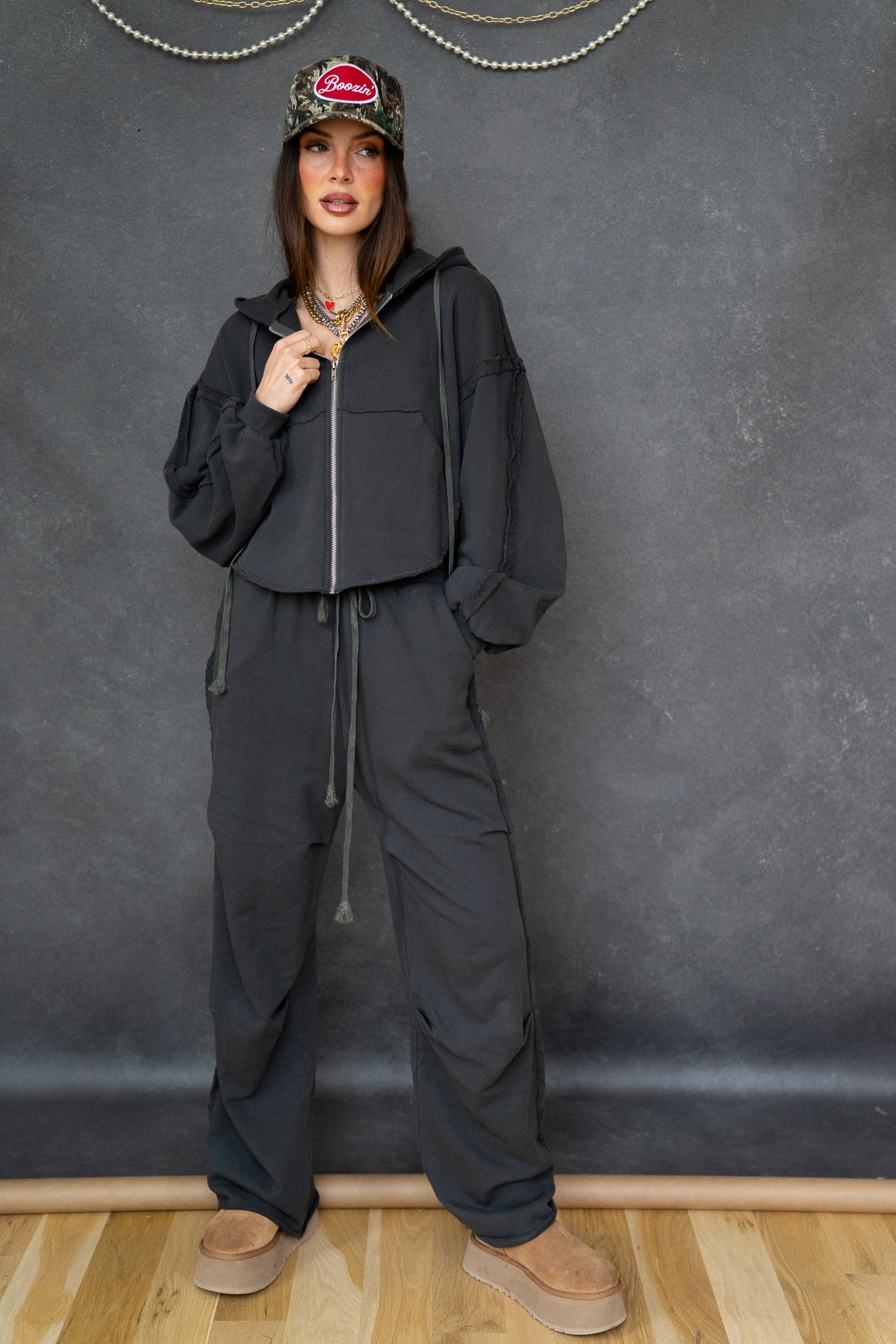 The Chelsea Set is an effortlessly cool, off-duty essential designed for comfort without sacrificing style. This matching set features a cropped zip-front hoodie paired with relaxed, wide-leg sweatpants, creating a perfectly balanced silhouette that feels laid-back yet intentional.