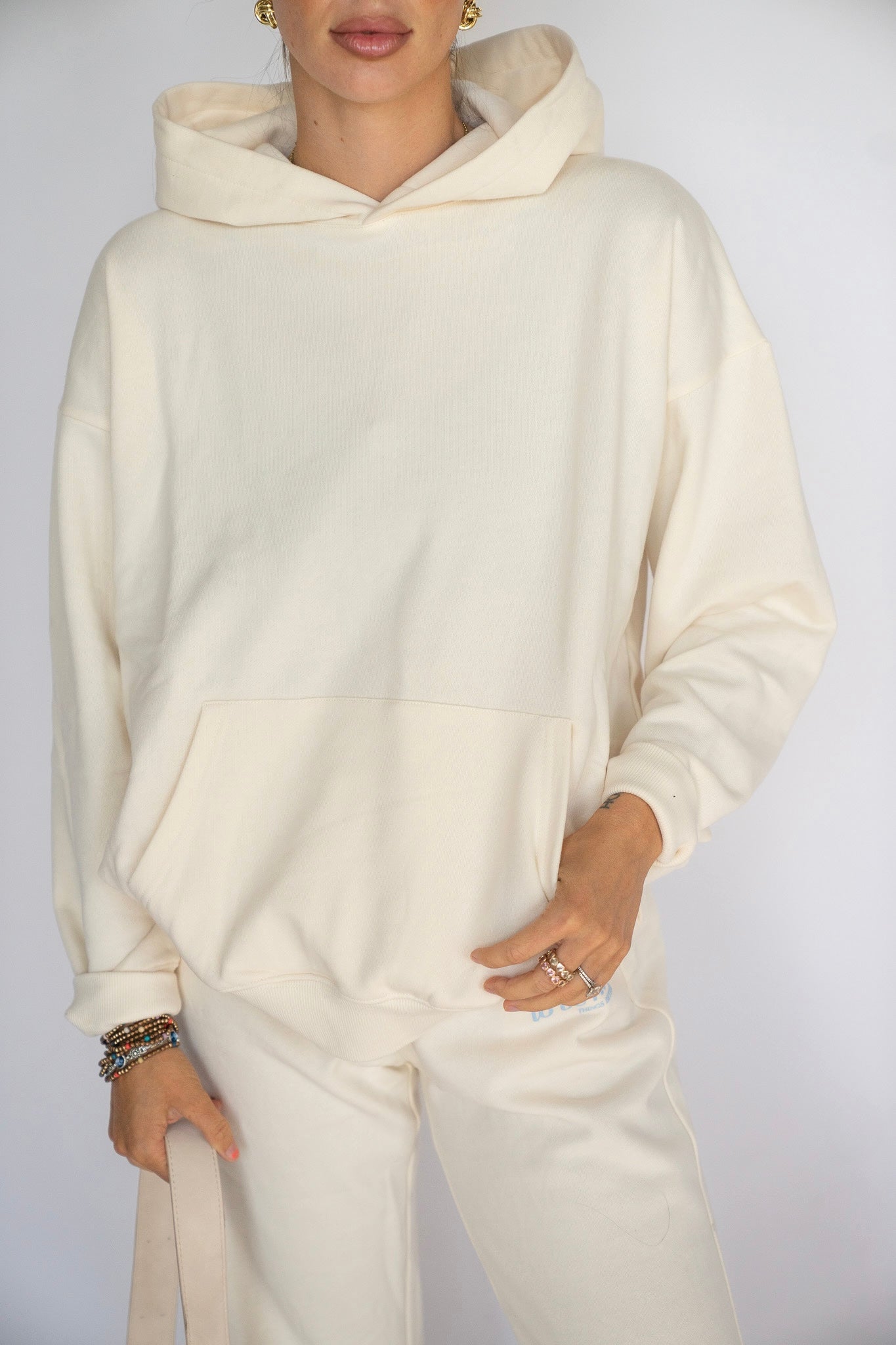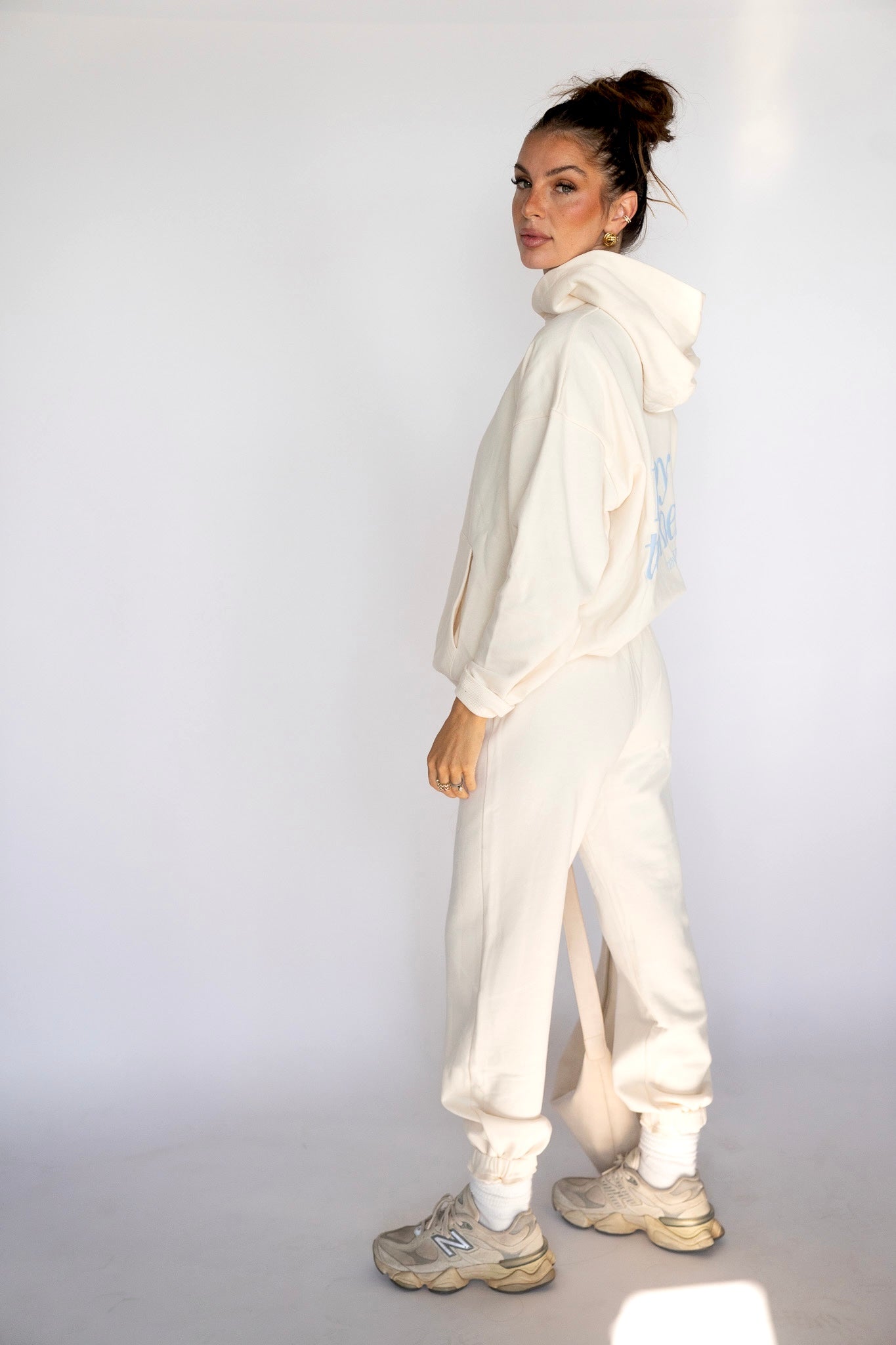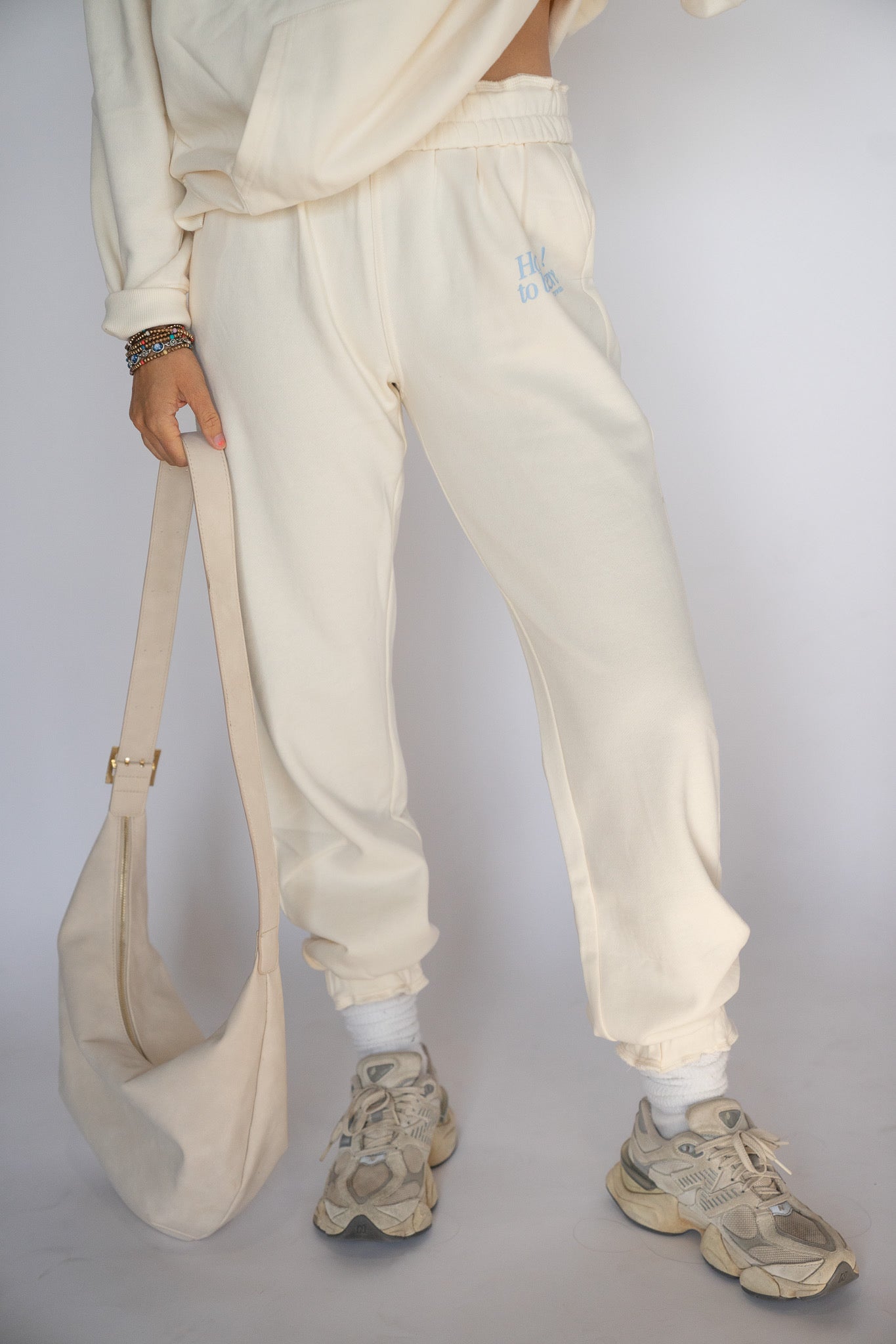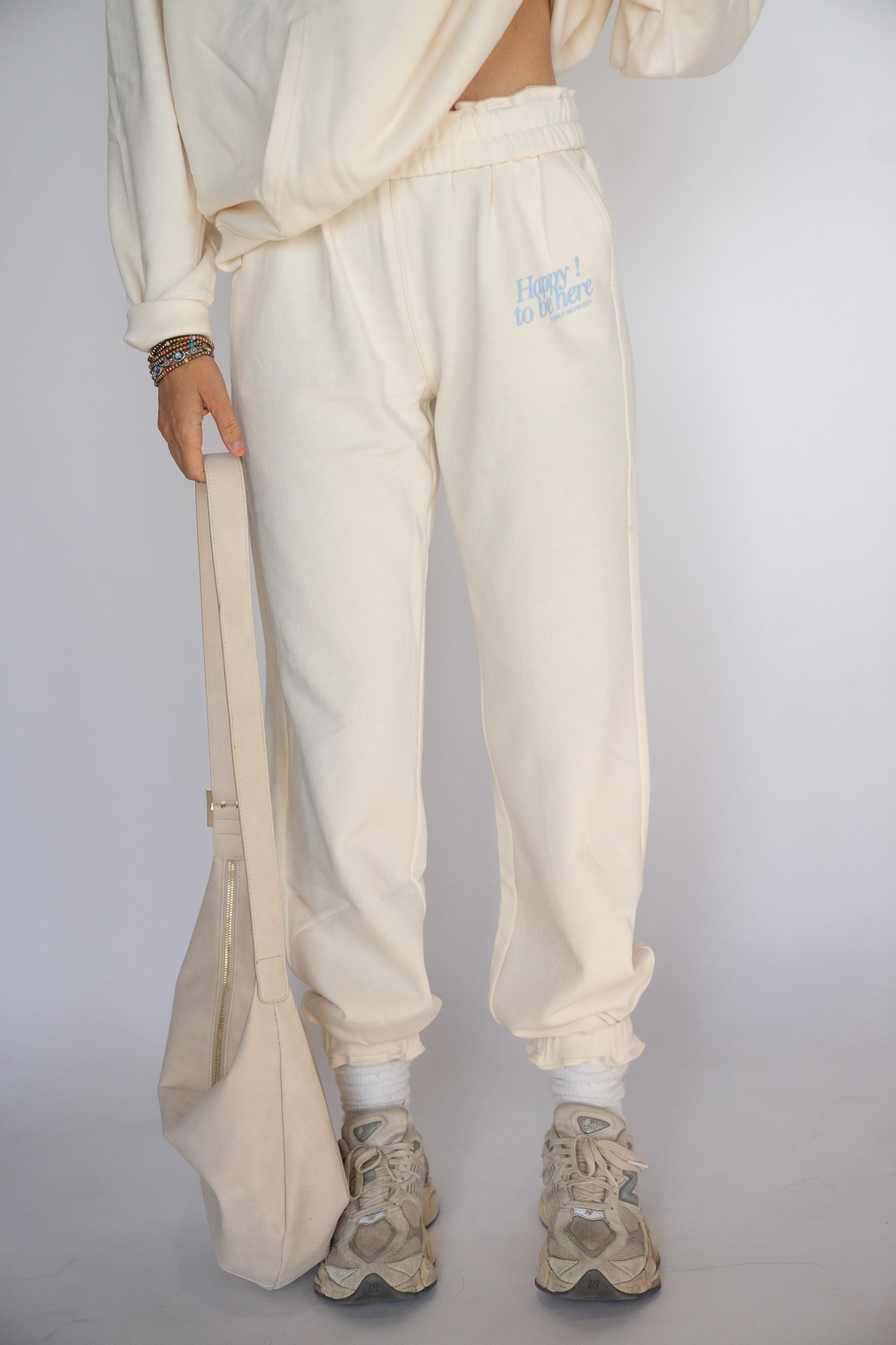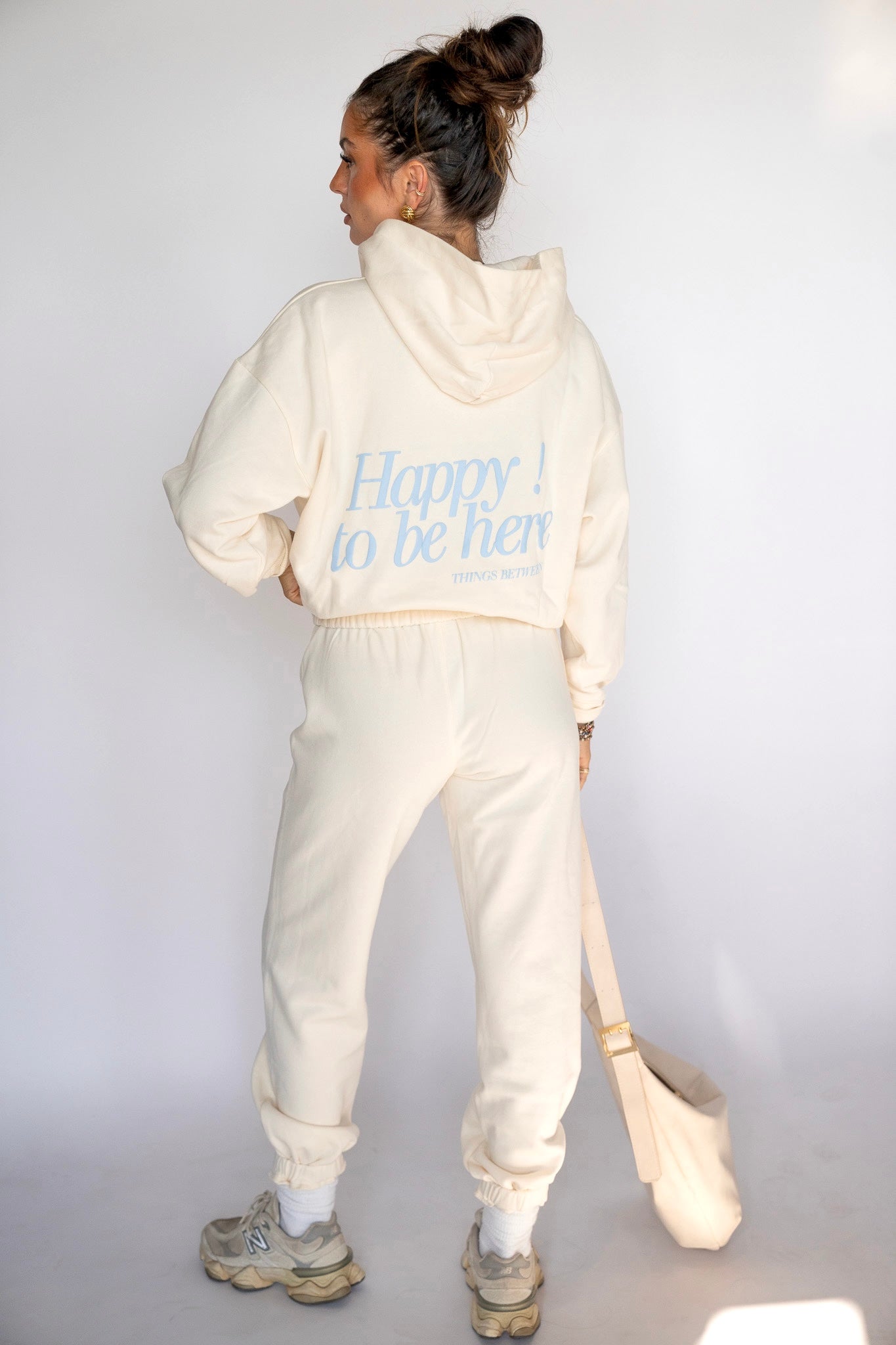 The most cozy relaxed fit sweatset featuring puff print “happy to be here” detailing in the back of the hoodie and the sweatpants.