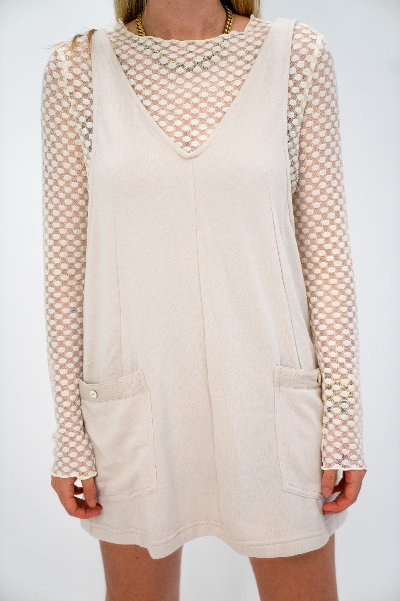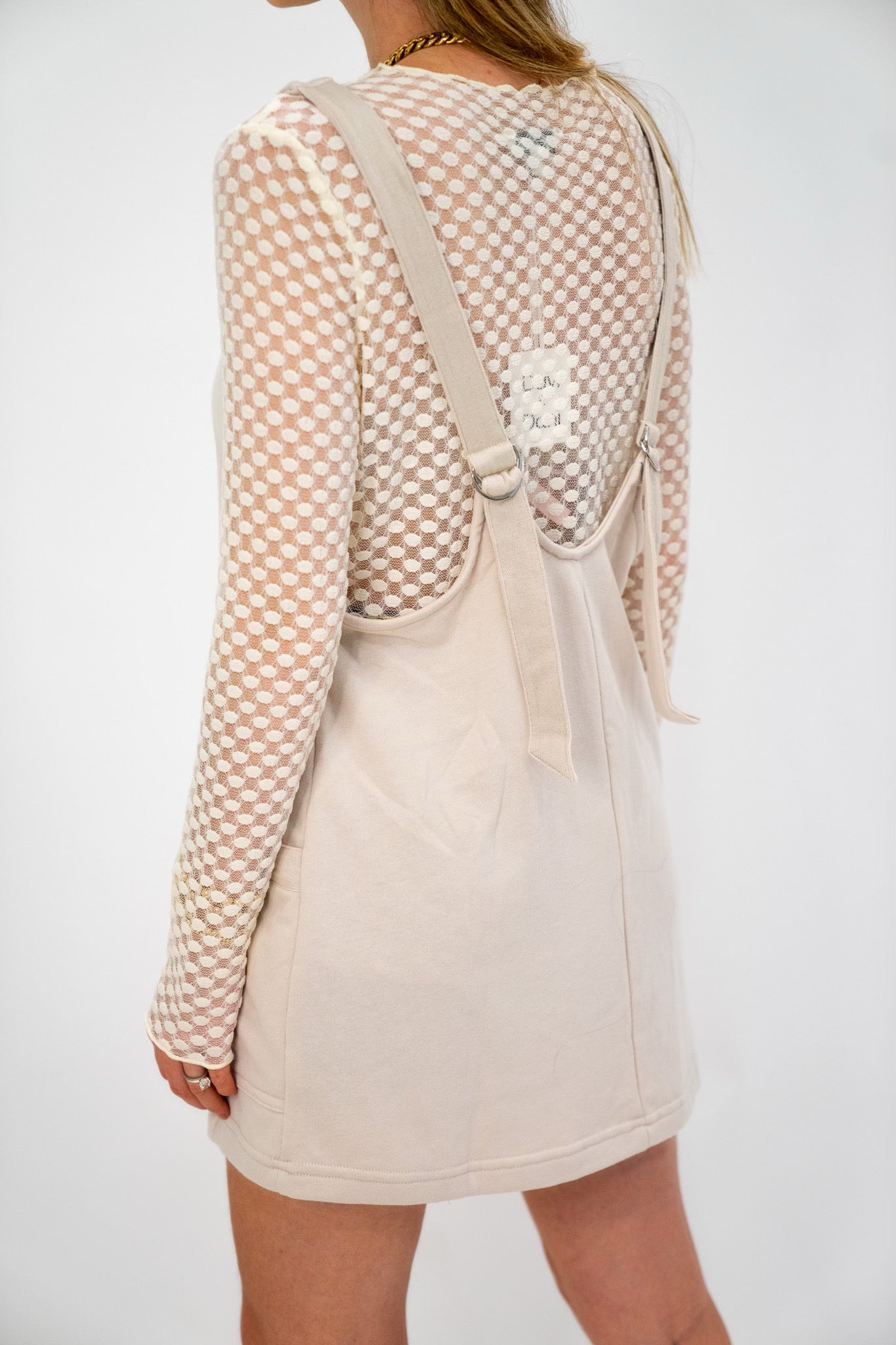 Terry cloth, overall dress with adjustable straps and front pockets! You are going to love this!