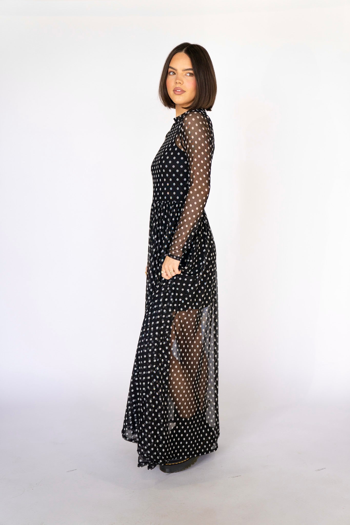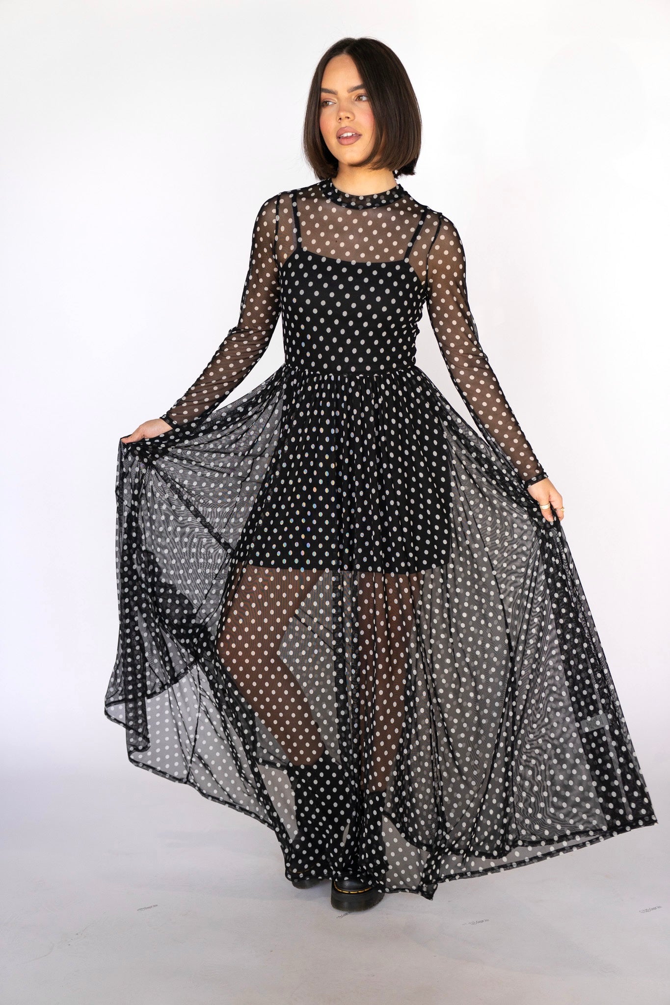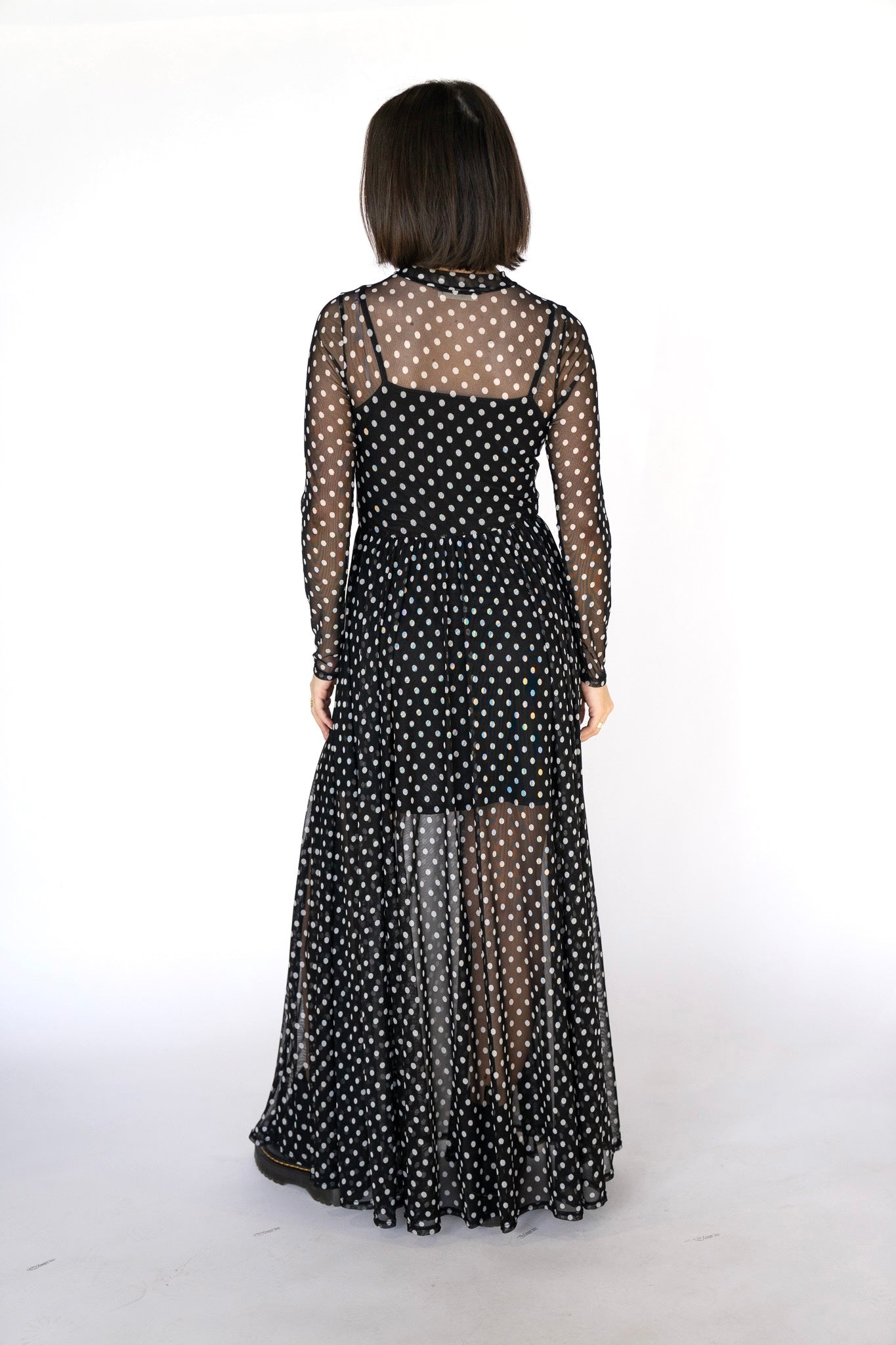 Elegant, flowing silhouette dress featuring star-like polka dot pattern, giving it a dreamy yet sophisticated feel!