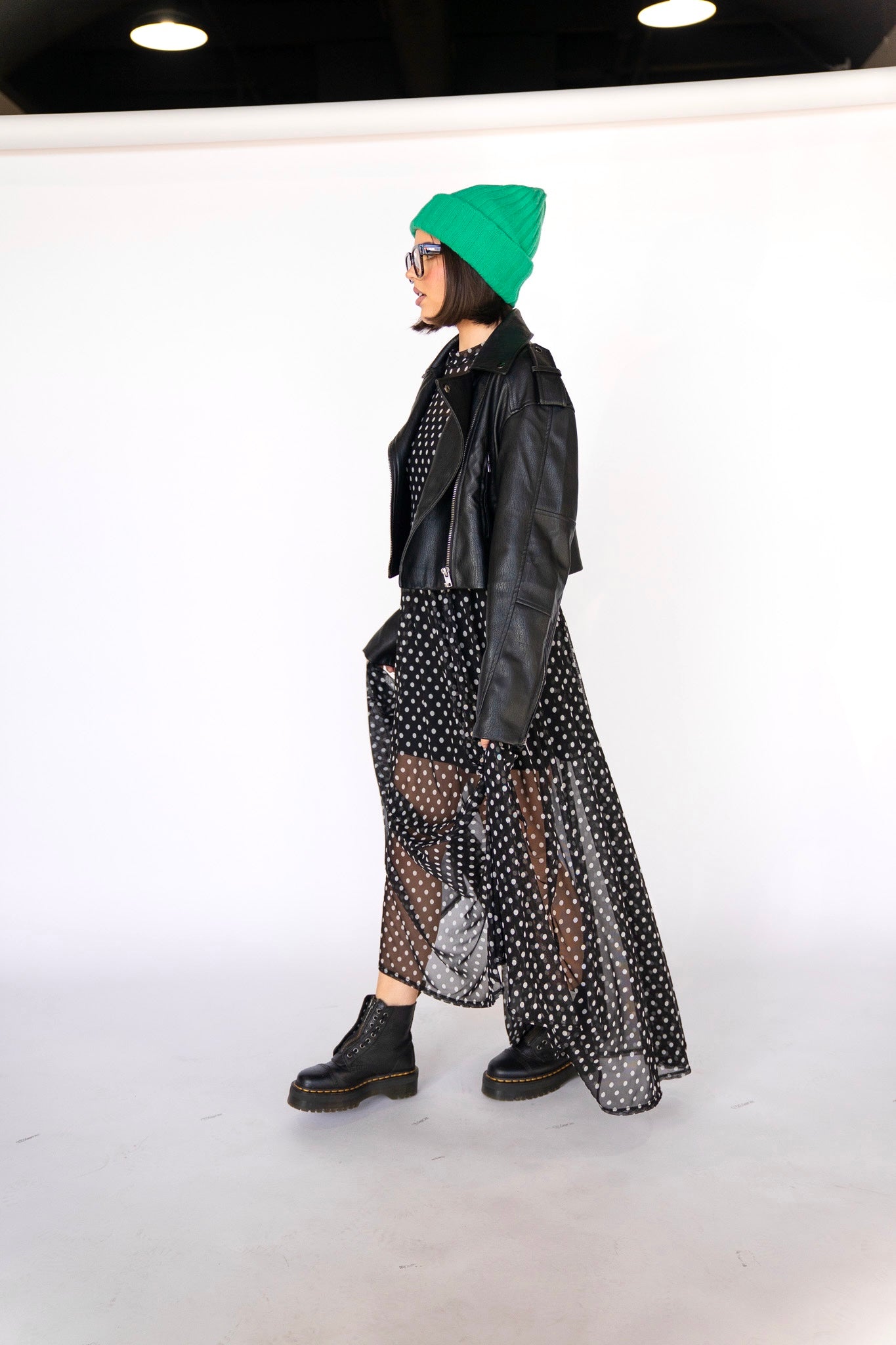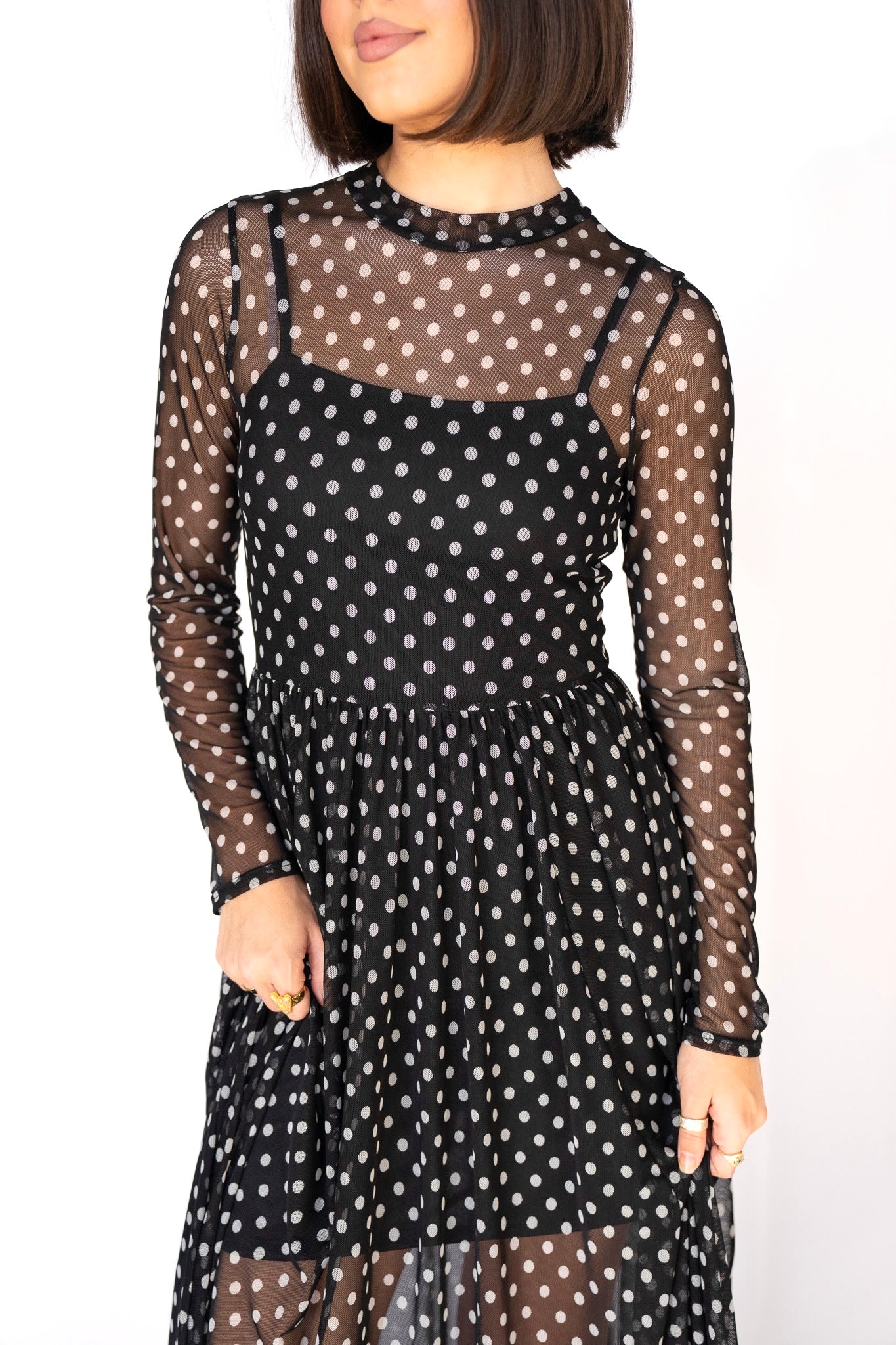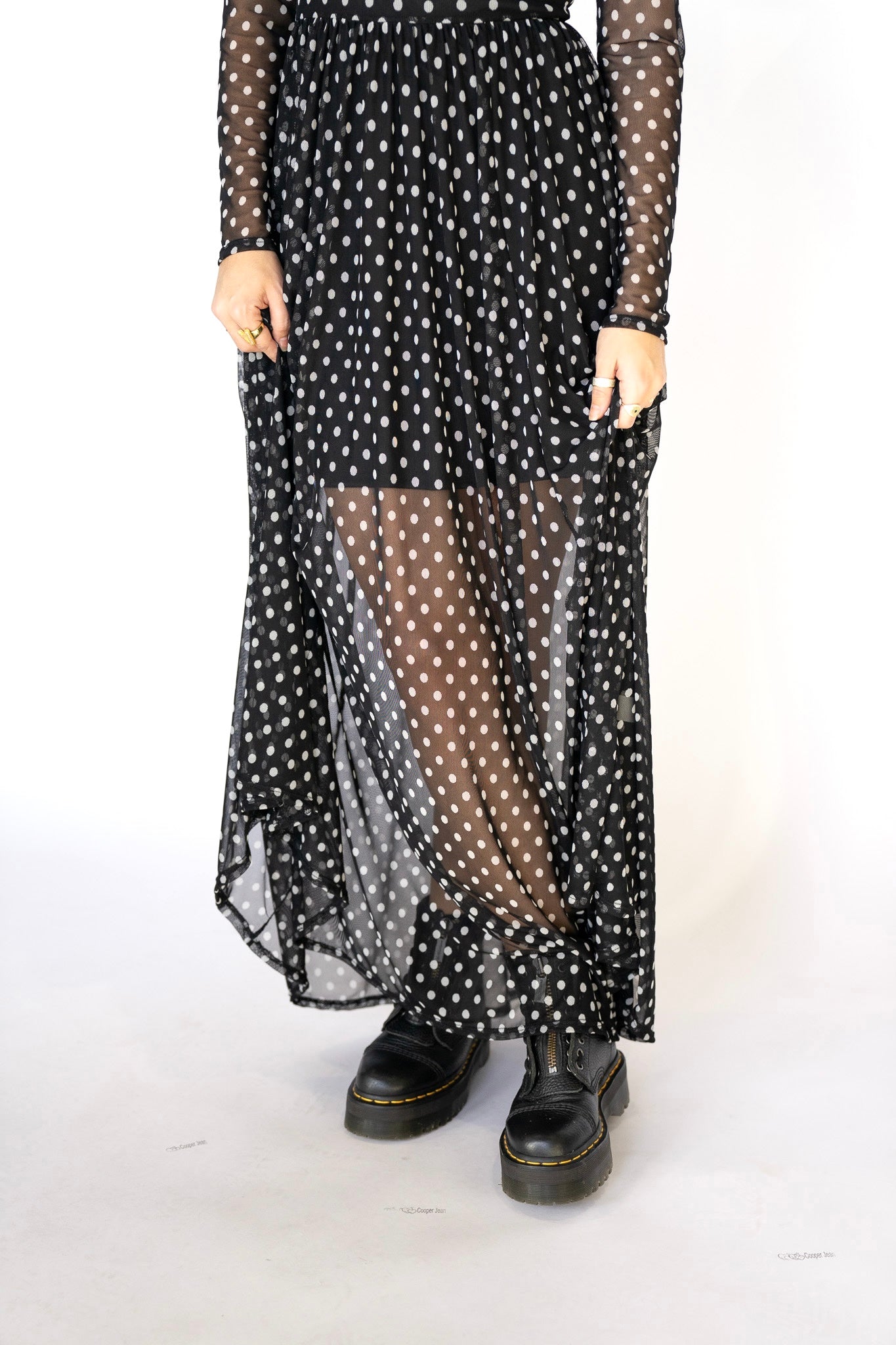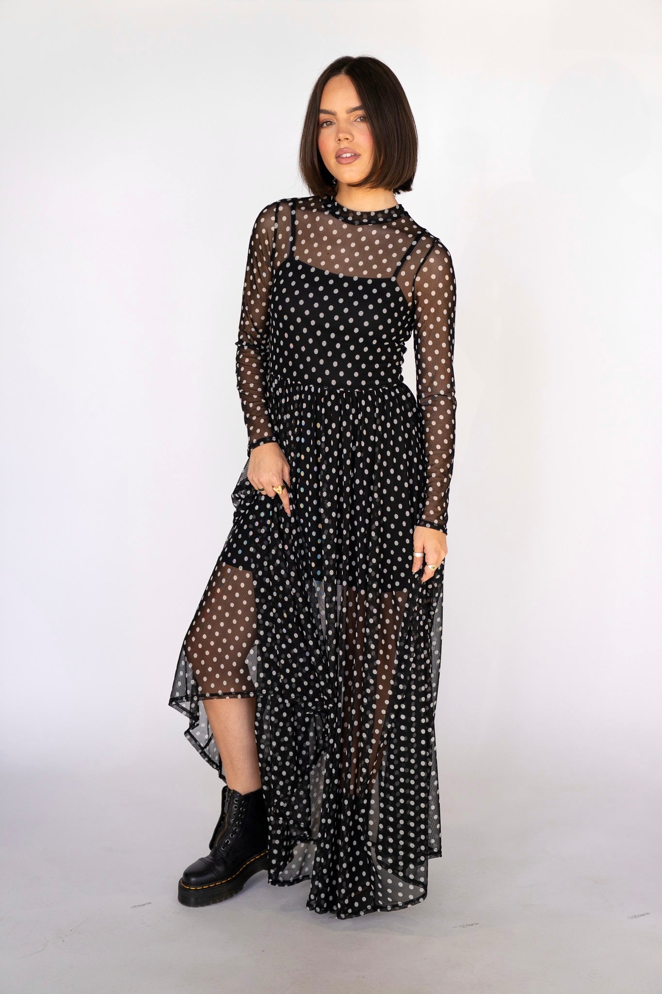 Elegant, flowing silhouette dress featuring star-like polka dot pattern, giving it a dreamy yet sophisticated feel!