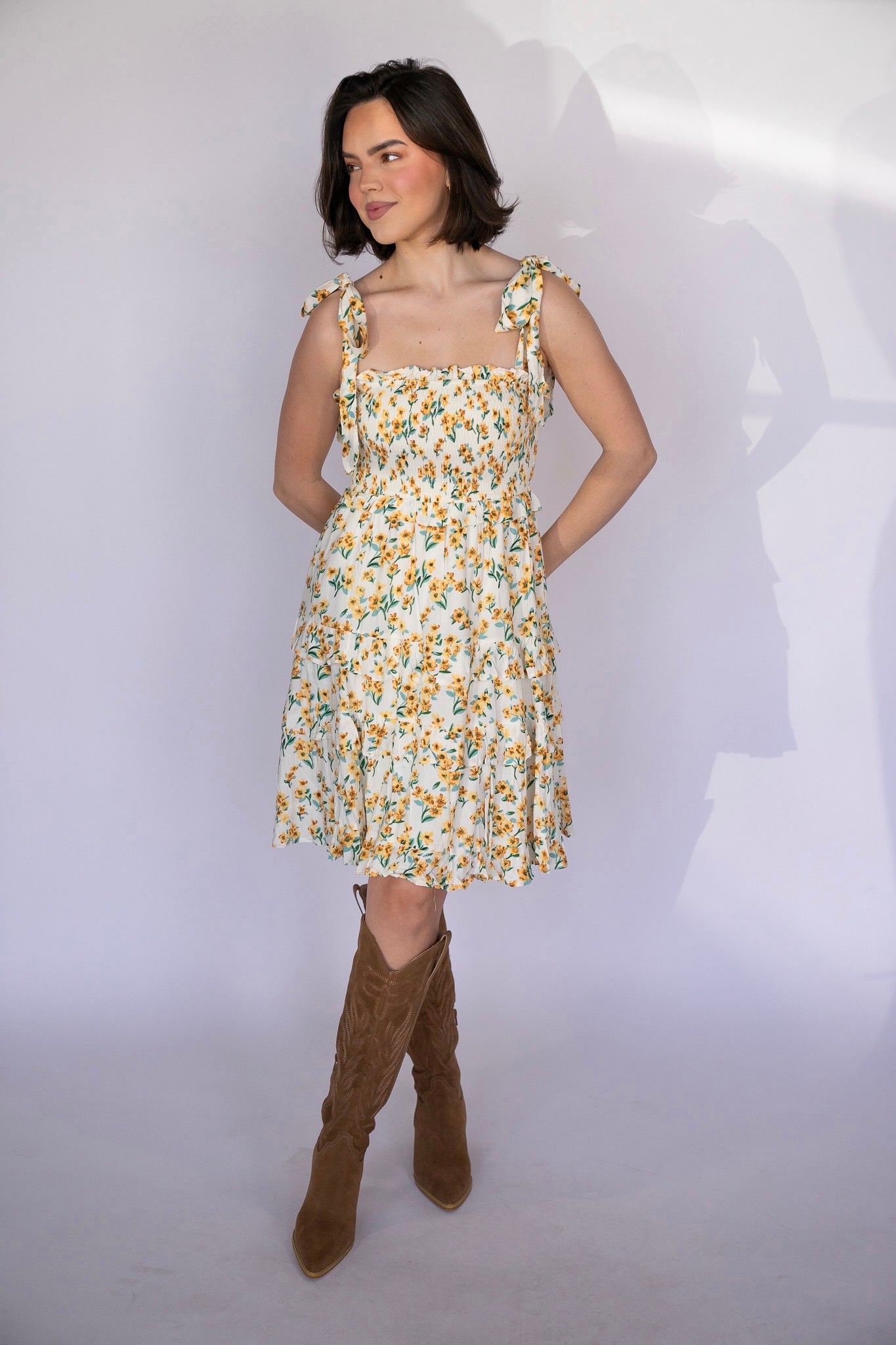 Radiate sunshine in the Sunny Fields Tie-Strap Mini, a playful and feminine dress that captures the essence of spring. Featuring a smocked bodice for a comfy, flattering fit and adjustable tie straps with ruffle trim, this dress is made for twirling. The soft white base is scattered with cheerful yellow floral print, while the tiered ruffle skirt adds volume and charm.