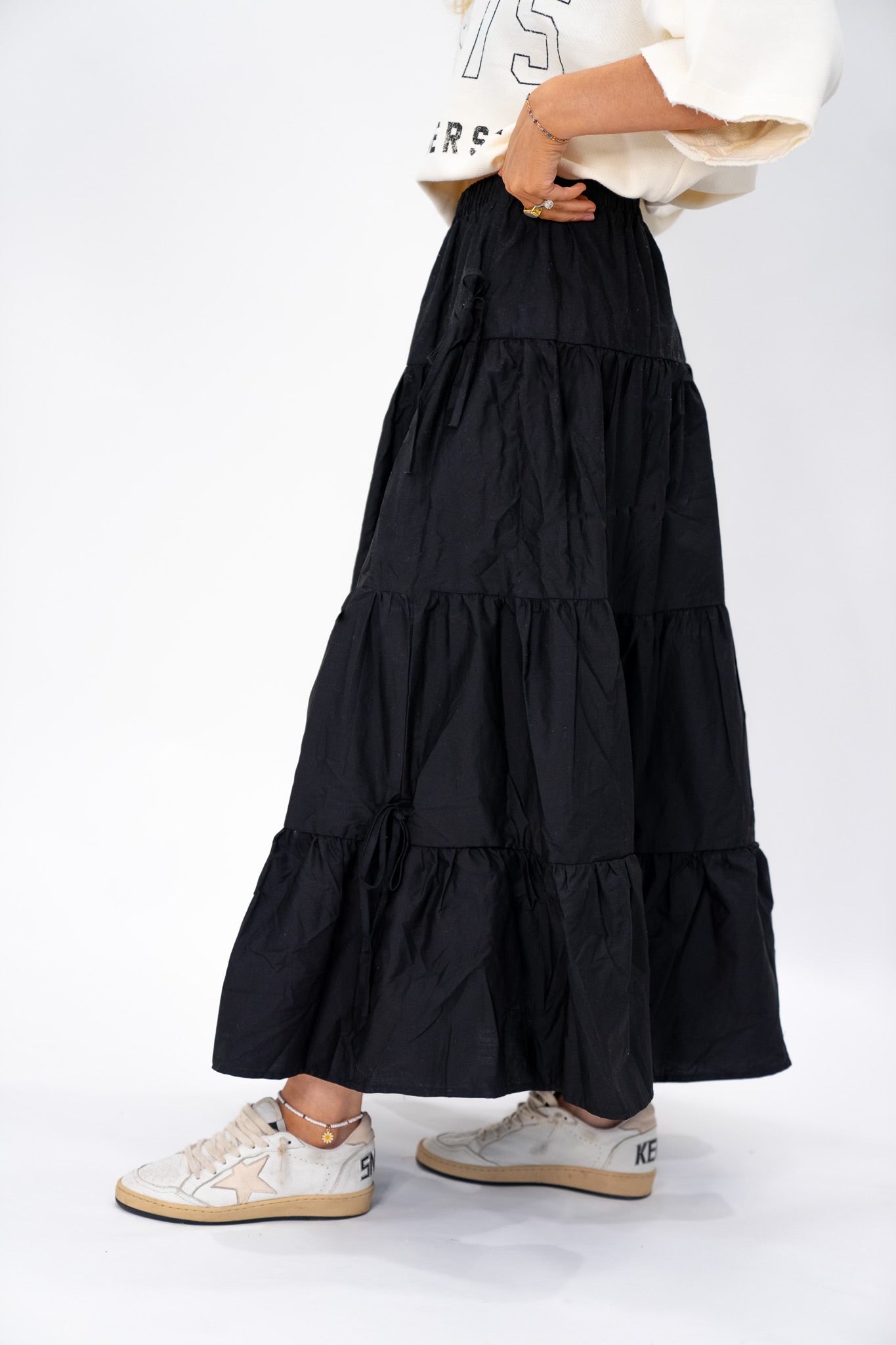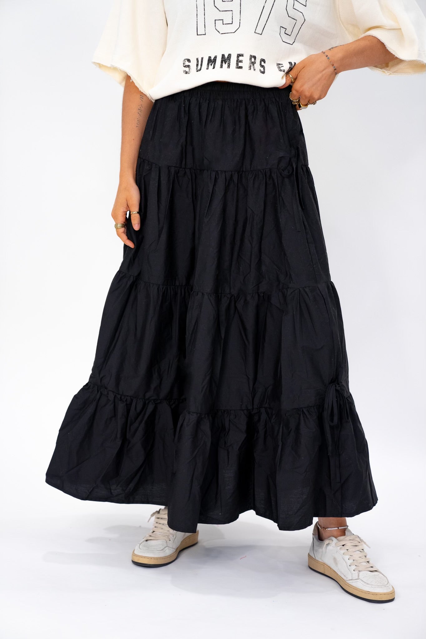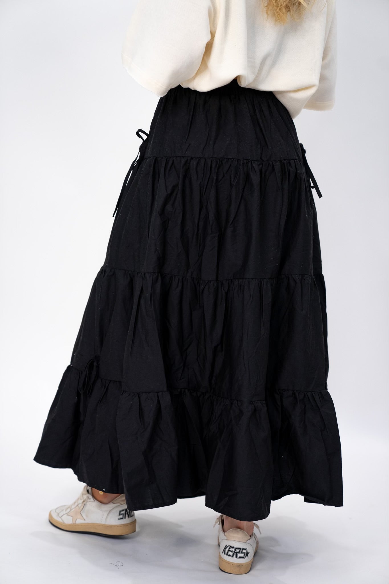 Tiered Maxi skirt with side bow details and elastic waistband.