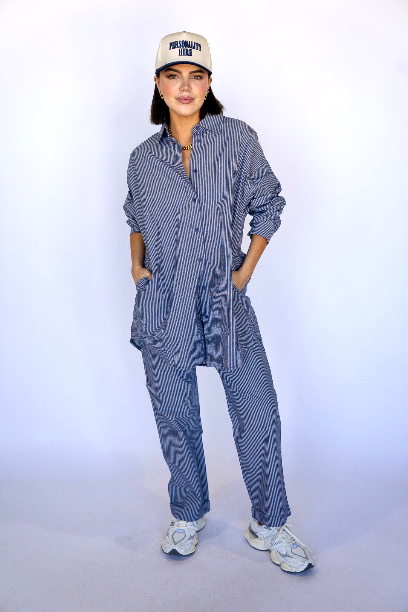 Effortlessly cool and endlessly versatile, the Urban Ease Striped Set, is your new go-to for laid-back sophistication. Featuring a relaxed-fit button-down shirt and matching straight-leg pants, this set is designed for those who love elevated comfort. The subtle pinstripe pattern gives it a tailored feel, while the oversized silhouette keeps it modern and effortless. Perfect for running errands, lounging in style, or dressing up with the right accessories—this set is a must-have for the fashion-forward minimalist.